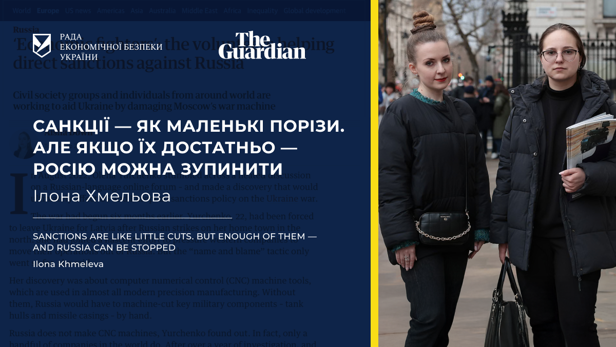 «На жаль, ефект санкцій не є миттєвим. Якщо ми запровадимо санкції сьогодні, результати побачимо наступного року. Але санкції — як маленькі порізи. Якщо їх достатньо — можна зупинити Росію», — наголосила Ілона Хмельова, секретар Ради економічної безпеки України (ESCU) для The Guardian.